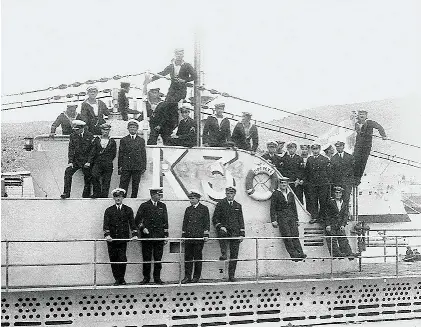 Ναύσταθμος Σαλαμίνας. Το πλήρωμα του «Πρωτεύς» στη γέφυρα του υποβρυχίου. Στις 29.12.1940, ευρισκόμενο σε περιπολία στην Αδριατική, έπληξε ιταλική νηοπομπή και βύθισε στον κόλπο του Αυλώνα το οπλιταγωγό «Sardegnia», αλλά εμβολίστηκε από ιταλικό υποβρύχιο και βυθίστηκε αύτανδρο (φωτογραφική συλλογή: Μ.Ε. Τσαγκάρη)