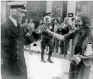 Επιστροφή του Πολεμικού Ναυτικού από τη Μέση Ανατολή. Κοπέλα υποδέχεται με ένα λουλούδι τον αντιπλοίαρχο Ι. Τούμπα, κυβερνήτη του Α/Τ «Αδρίας». Δεξιά, ο ανθυποπλοίαρχος Στέφανος Τρουπάκης στο εν πλω από Αλεξάνδρεια προς Χάιφα υποβρύχιο «Κατσώνης». Χάθηκε με το υποβρύχιο και άλλους 31 στις 14.9.1943, όταν ο «Κατσώνης» βυθίστηκε κοντά στη Σκιάθο.
