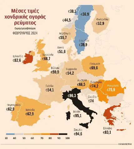 Η µέση χονδρεµπορική τιµή στην Ελλάδα τις πρώτες 7 ηµέρες του Φεβρουαρίου διαµορφώνεται στα 83,11 ευρώ/ µεγαβατώρα, 29 ευρώ υψηλότερα από την τιµή της Γερµανίας και της Γαλλίας (54 ευρώ/ µεγαβατώρα), 20 ευρώ υψηλότερα από την τιµή της µεγαβατώρας στην Ισπανία και την Πορτογαλία και 7 ευρώ υψηλότερα από την τιµή της µεγαβατώρας στη διασυνδεδεµένη αγορά της Βουλγαρίας.
