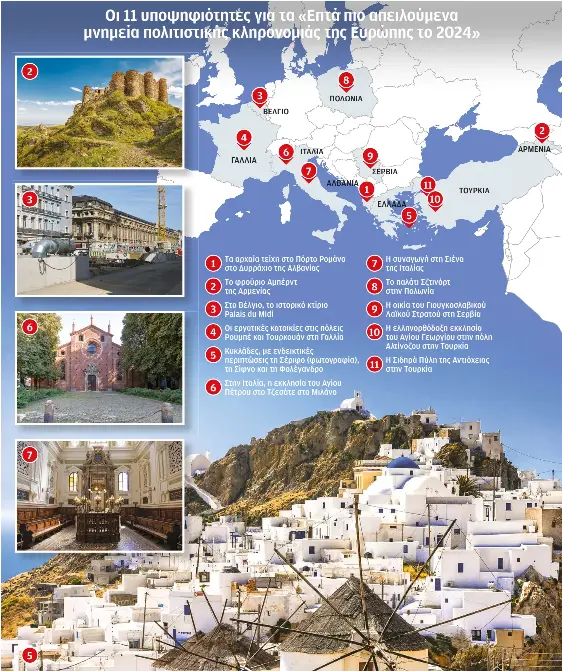 «Τα επιλεγµένα µνηµεία πολιτιστικής κληρονοµιάς απειλούνται από την κατεδάφιση, τη στρεβλή ανάπτυξη, τις ολέθριες συνέπειες φυσικών καταστροφών, την παραµέληση ή την έλλειψη χρηµατοδότησης», δηλώνει ο εκτελεστικός πρόεδρος της Europa Nostra, καθηγητής δρ Χέρµαν Πάρτσιντζερ, για τα 11 πιο απειλούµενα µέρη και µνηµεία στην Ευρώπη που απαρτίζουν τη λίστα για το 2024.