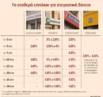 Σε μειώσεις των σταθερών επιτοκίων στα στεγαστικά δάνεια προχωρούν οι τράπεζες, σε μια προσπάθεια να τονώσουν το ενδιαφέρον των δυνητικών αγοραστών. Σήμερα, οι τράπεζες χορηγούν στεγαστικά με σταθερό επιτόκιο ακόμη και 3% για μία τριετία. Παράλληλα, θα παρατείνουν το «πάγωμα» των επιτοκίων που αποφασίστηκε πέρυσι και ισχύει μέχρι τον Μάιο. Το μέτρο αφορά μόνο τους συνεπείς δανειολήπτες.