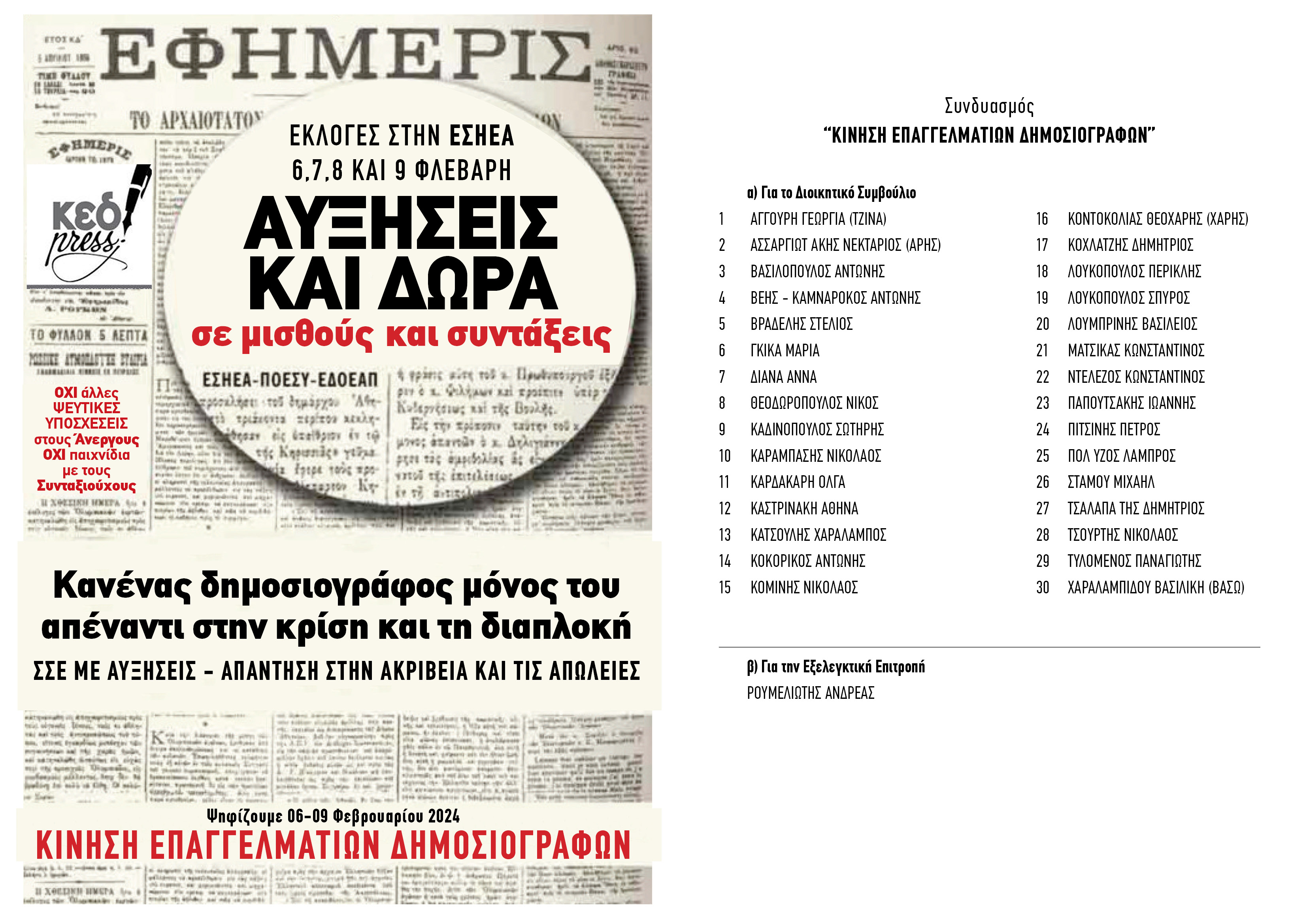 Συνάδελφοι, οι ώρες είναι κρίσιμες. Διανύουμε τη δεύτερη δεκαετία με διαλυμένους μισθούς, δουλειά με το μπλοκάκι, ωράριο λάστιχο, συντάξεις - υπόλοιπα από την σφαγή του Κατρούγκαλου, με τσακισμένα δικαιώματα και με την ακρίβεια να θερίζει. Οι τελευταίες ΣΣΕ του κλάδου έγιναν την τριετία 2008-10 και συνεχώς αποδομούνται. Από τότε οι "πρόθυμοι", που ως πλειοψηφία στο ΔΣ, παρέδωσαν την ΕΣΗΕΑ και τον ΕΔΟΕΑΠ λάφυρο στους εργοδότες και τις διαδοχικές κυβερνήσεις της τελευταίας δεκαετίας, πήραν αντάλλαγμα τις καρέκλες τους και ΟΧΙ ΜΟΝΟ ! Οι παροχές από το Ταμείο μας (περίθαλψη, φάρμακα, εφάπαξ) συνεχώς μειώνονται, ενώ πόροι δεκάδων εκατομμυρίων ευρώ δόθηκαν από το 2017 και συνεχίζουν να δίνονται στους εργοδότες. Τα εκατομμύρια ευρώ, περιουσία της ΕΣΗΕΑ και ΤΟΥ ΕΔΟΕΑΠ από το αγγελιόσημο μένουν στον ΕΦΚΑ. ΔΕΝ τα ζητάει κανείς...!!! Ούτε και αυτά που οφείλουν εκδότες, καναλάρχες, και διαφημιστές! Το καθεστώς της σύμπραξης συνδικαλιστών ΣΥΡΙΖΑ-ΝΔ που έχει κάνει την Ένωση και το Ταμείο μας εργαλείο της διαπλοκής, μπορεί ΤΩΡΑ να κλυδωνίζεται γιατί έπεσαν οι μάσκες, αλλά ΕΠΙΤΕΛΟΥΣ ΠΡΕΠΕΙ ΝΑ ΤΕΛΕΙΩΣΕΙ. Αν θέλουμε να αλλάξει η ζωή μας... Συνάδελφοι, η απάντησή μας πρέπει να είναι η μαζική μας συμμετοχή στις εκλογές και η καταψήφιση της απερχόμενης διοίκησης, που θέλει τώρα να βάλει ΠΑΡΑΝΟΜΑ από το παράθυρο στην ΕΣΗΕΑ τουλάχιστον 600 μέλη από την ΕΣΠΗΤ, μήπως και κρατήσει τον έλεγχο! Θέλουν να επαναλάβουν το πραξικόπημα που έστησαν στον ΕΔΟΕΑΠ και στην ΕΣΗΕΑ, βάζοντας πλάτη στην Κυβέρνηση για την χειραγώγηση δημοσιογράφων και κοινής γνώμης. ΨΗΦΙΖΟΥΜΕ ΟΧΙ ΣΕ ΟΛΑ λοιπόν, για την θλιβερή σύμπραξη στη διοίκηση της ΕΣΗΕΑ ΚΑΙ ΤΟΥ ΕΔΟΕΑΠ. Μόνο αν αλλάξει η διοίκηση στην ΕΣΗΕΑ θα αλλάξει η ζωή μας… Απαιτούμε χωρίς άλλη καθυστέρηση: - Συλλογικές συμβάσεις εργασίας με αυξήσεις σε μισθούς και δώρα για όλους τους εργαζόμενους. - Συντάξεις με πραγματικές αυξήσεις και δώρα από τον ΕΦΚΑ και τον ΕΔΟΕΑΠ όπως λέει και η απόφαση του ΣτΕ ( 2287/15). - Οι επαγγελματικές δαπάνες των συναδέλφων ΝΑ ΜΕΙΩΝΟΥΝ τη φορολογία και όχι το πραγματικό εισόδημα. - Προγράμματα για επιδότηση των ανέργων και συνθήκες αξιοπρέπειας για κάθε δημοσιογράφο. - Πλουραλισμό και αξιοπιστία στην ενημέρωση…